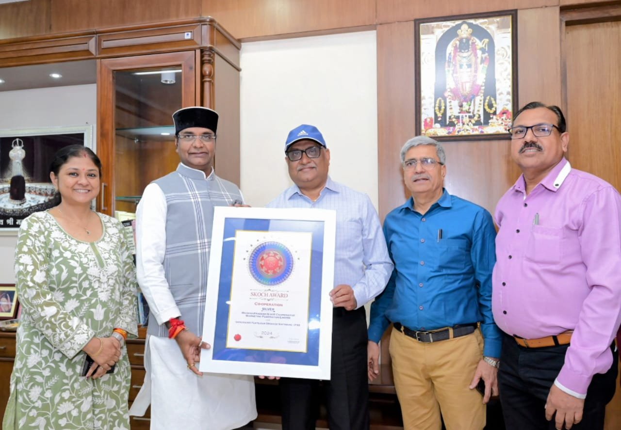 सहकारिता मंत्री श्री विश्वास कैलाश सारंग को गुरुवार को मंत्रालय में प्रबंध संचालक विपणन संघ श्री आलोक कुमार सिंह ने नई दिल्ली में प्राप्त “स्कॉच’’ अवॉर्ड सौंपा। नई दिल्ली के इण्डिया हेबिटेड सेंटर में आयोजित 100वें राष्ट्रीय स्कॉच समिट में मध्यप्रदेश के सहकारिता विभाग के राज्य सहकारी विपणन संघ (मार्कफेड) को उनके फर्टिलाइजर सप्लाई चैन ऑटोमेशन प्रोजेक्ट आईएफएसएस को प्रतिष्ठित स्कॉच अवॉर्ड से सम्मानित किया गया। प्रबंध संचालक विपणन संघ श्री सिंह की ओर से आईएफएसएस प्रोजेक्‍ट हेड श्रीमती मंदिरा लोध एवं प्रोजेक्ट मैनेजर श्री नितेन्द्र सिंह द्वारा अवॉर्ड ग्रहण किया गया।